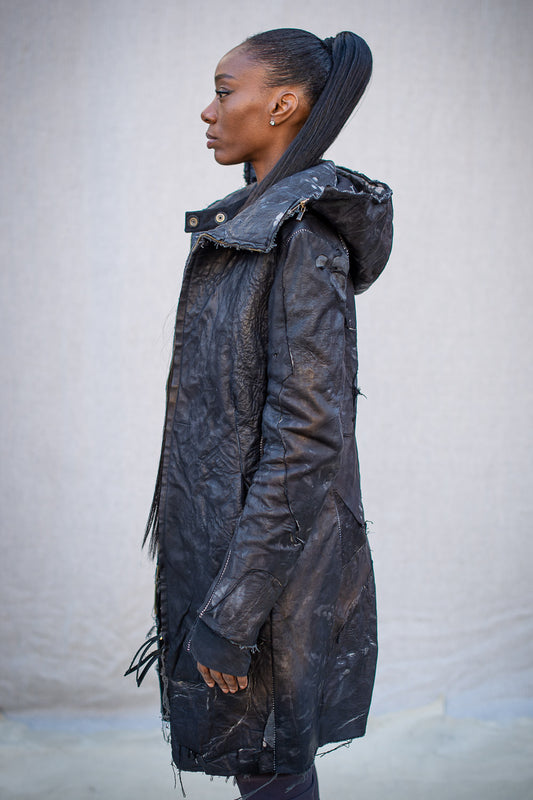 FW24 || ZIP-OFF HOOD UNLINED LEATHER COAT || BLACK MOONSTAR