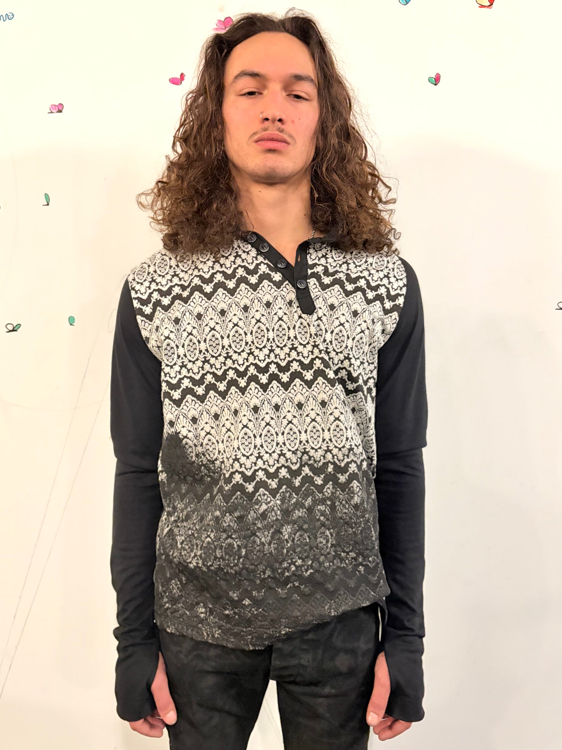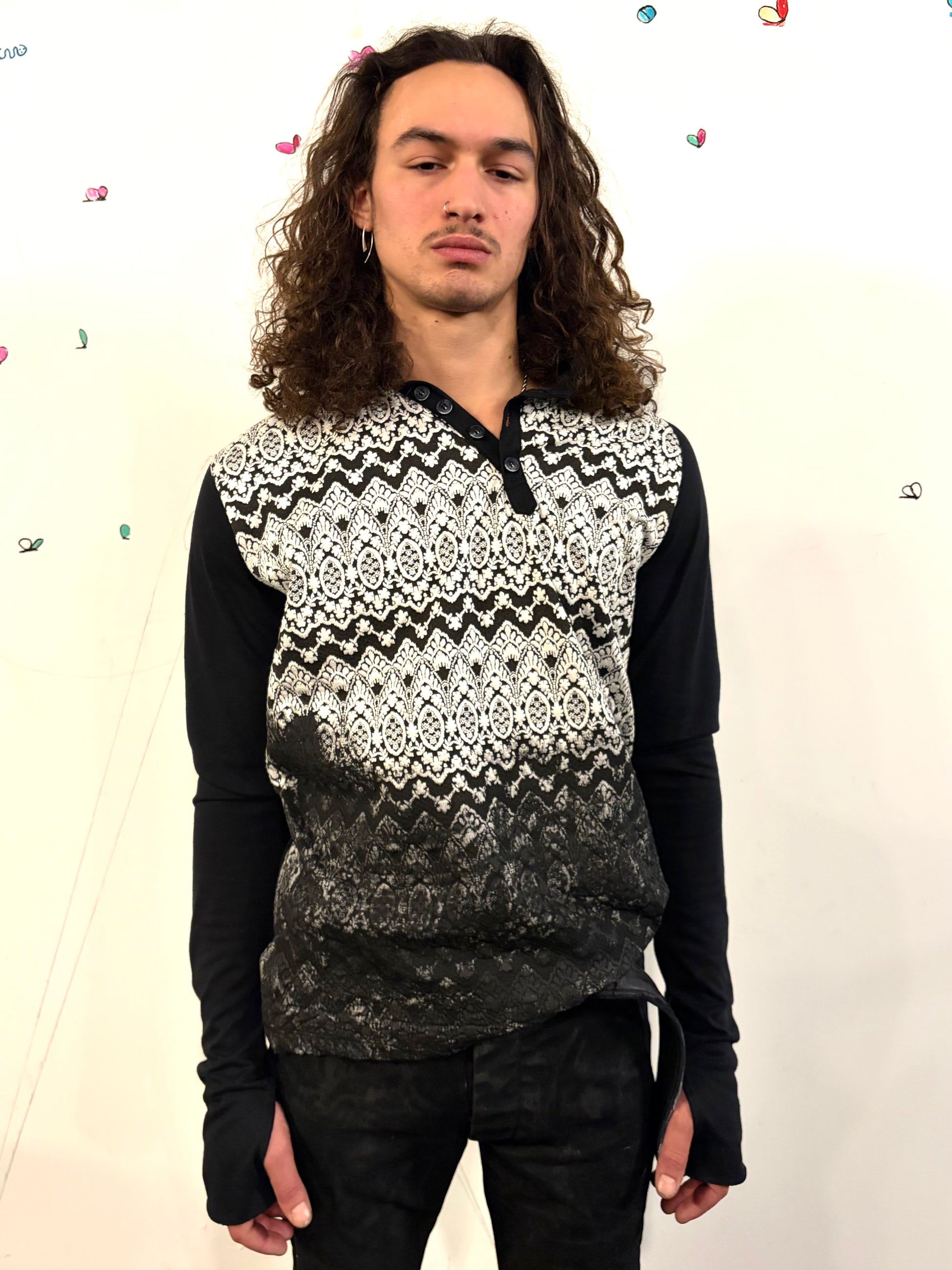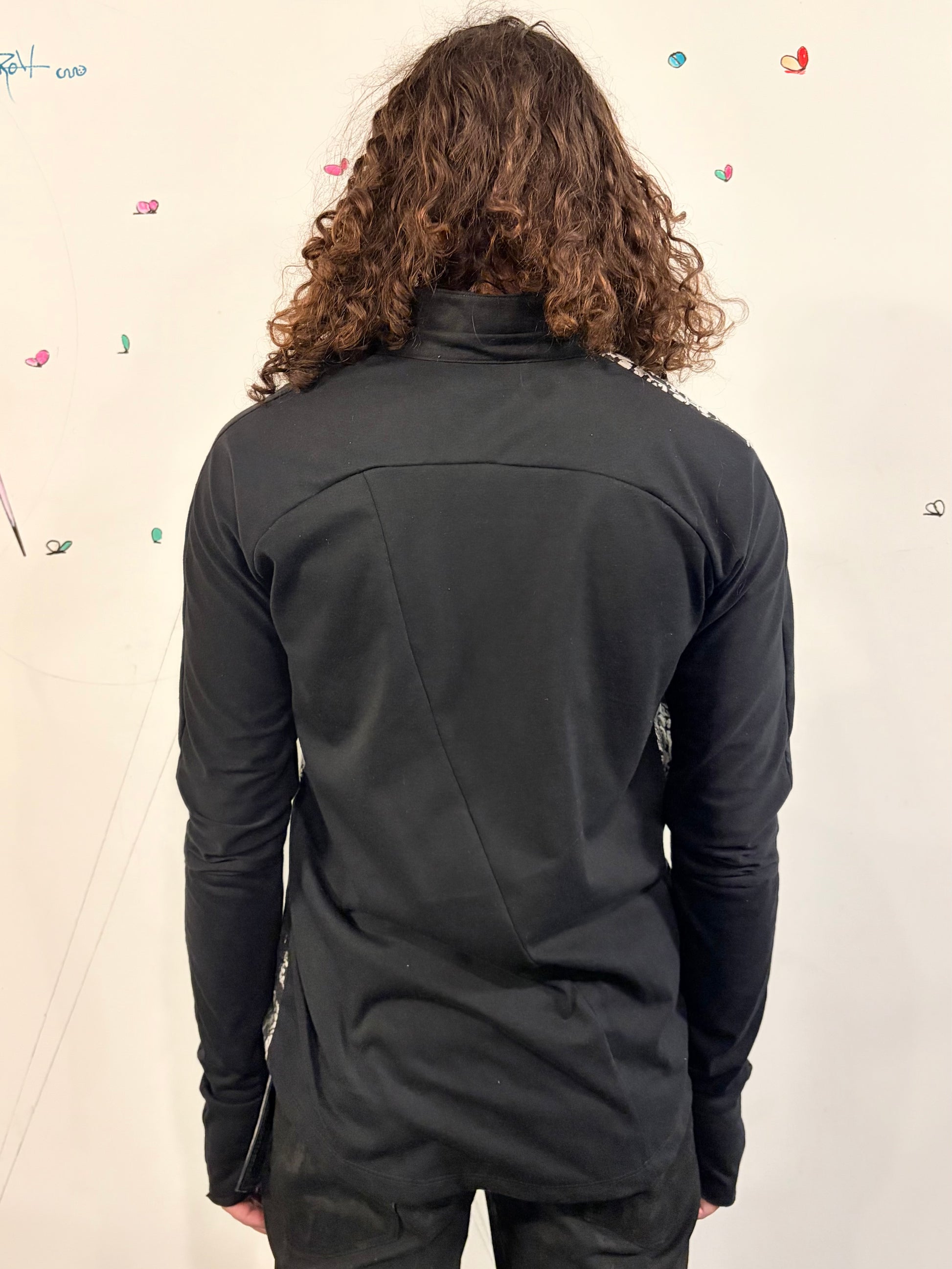 The 3DT is an interesting take and update on the T-Shirt that has been in and out of our rotation since the 2013 season. The shirt is made of two different fabrics, with the front being one fabric, and the sleeves/back/back-body are another. The shirt is cut where one side of the front has a raglan like detail and the other side has a set-in sleeve. The back of the shirt is cut with asymmetrical seams so that no part of the shirt is identical from front to back. The front is made of a cotton / poly knit brocade, and the back is made of a 100% cotton jersey in a medium weight. the shirt has an asymmetric polo neck with an off kilter button collar