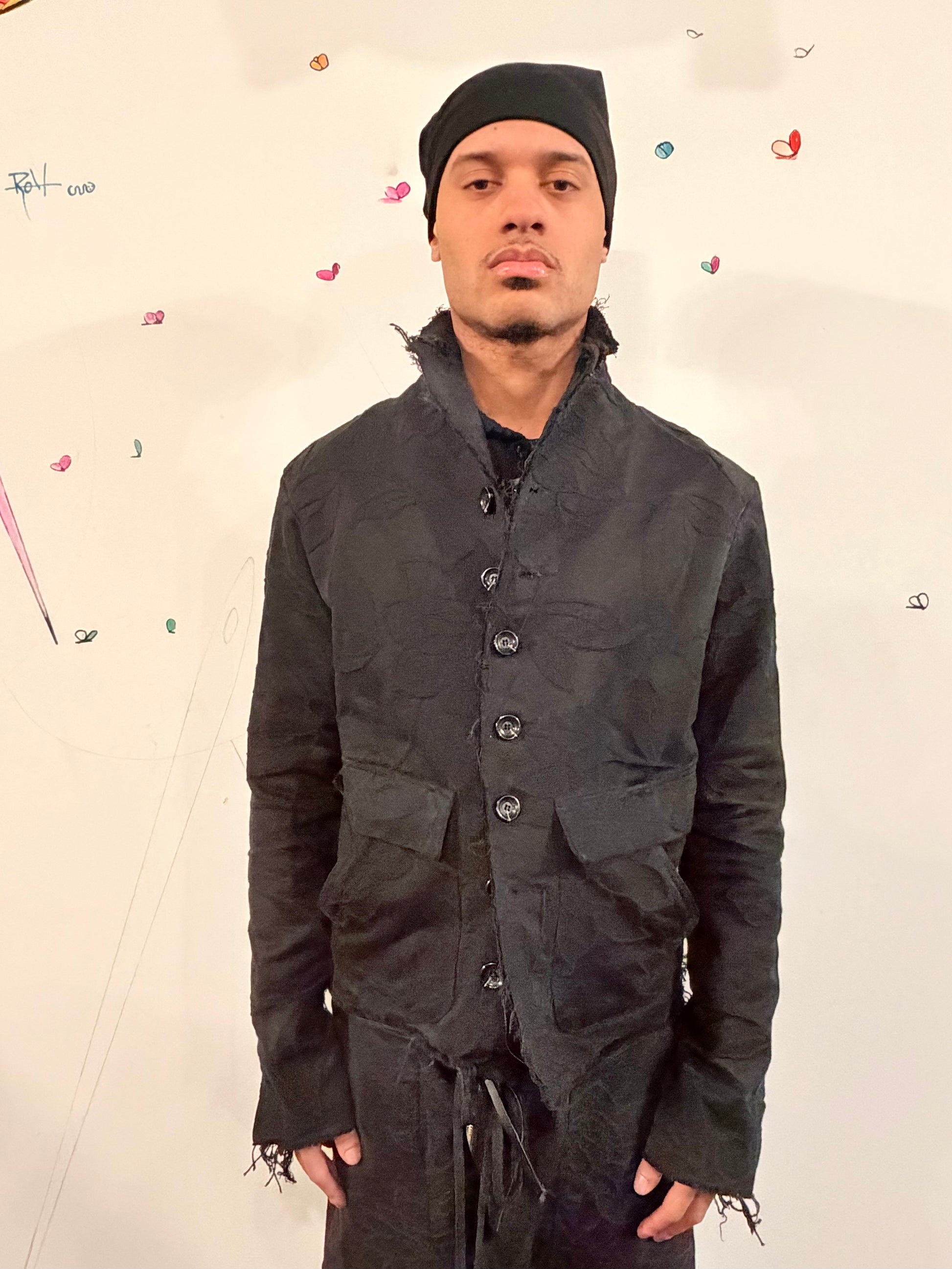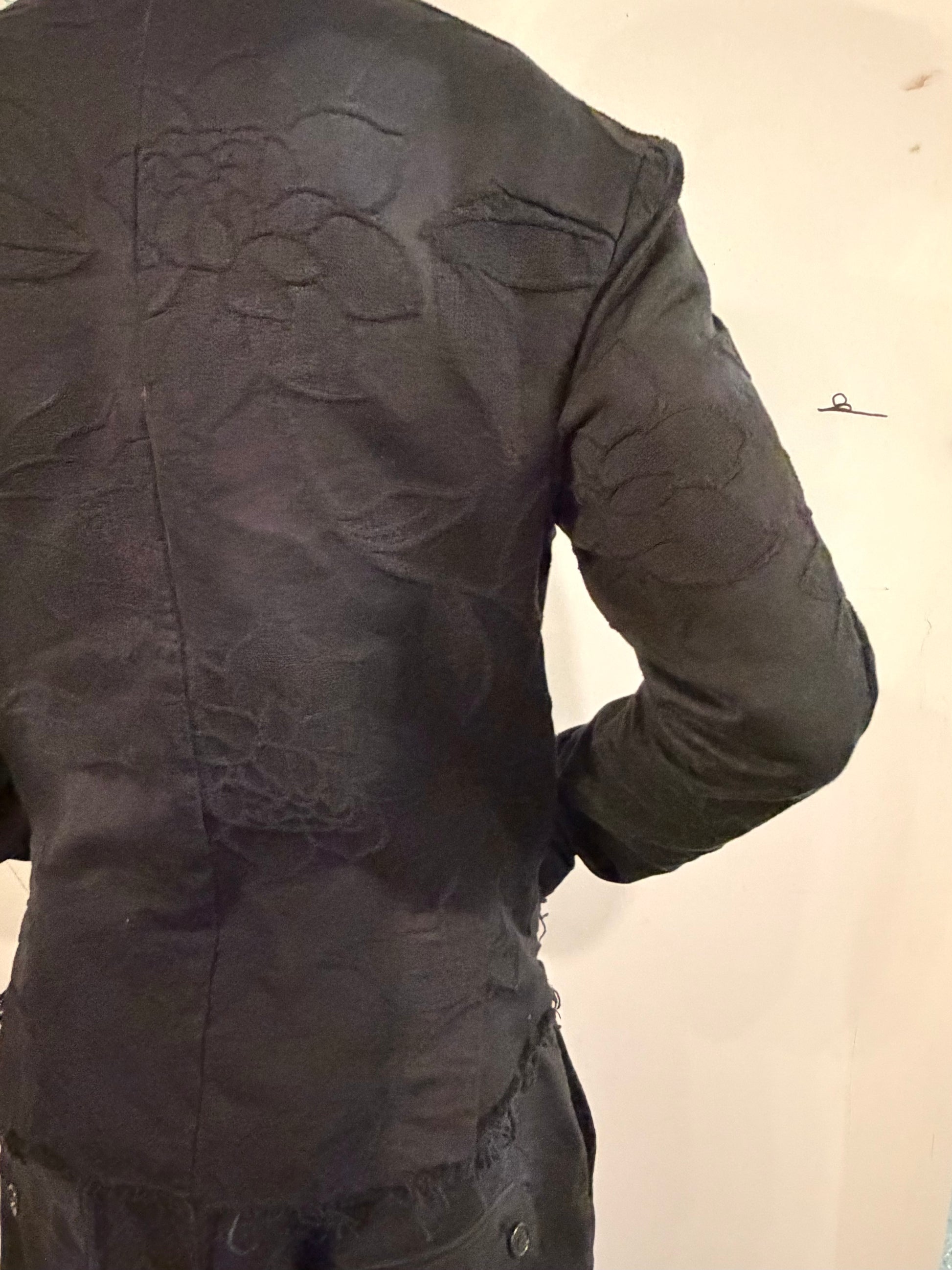 This version of the blazer is made from a medium weight silk + cotton brocade with a very dense weave and is unlined. It has two double front pockets with flap closures which allow you to enter the inner portion of the pocket from the top horizontally, and the outer portion from the side vertically. The jacket has two back vents, working surgeon cuffs on the sleeve. The front lapel and collar of the jacket is left unfinished for a rough "hewn" look. The fabric of this blazer was originally white; it has been over-dyed black and treated for a marbled artisanal texture.