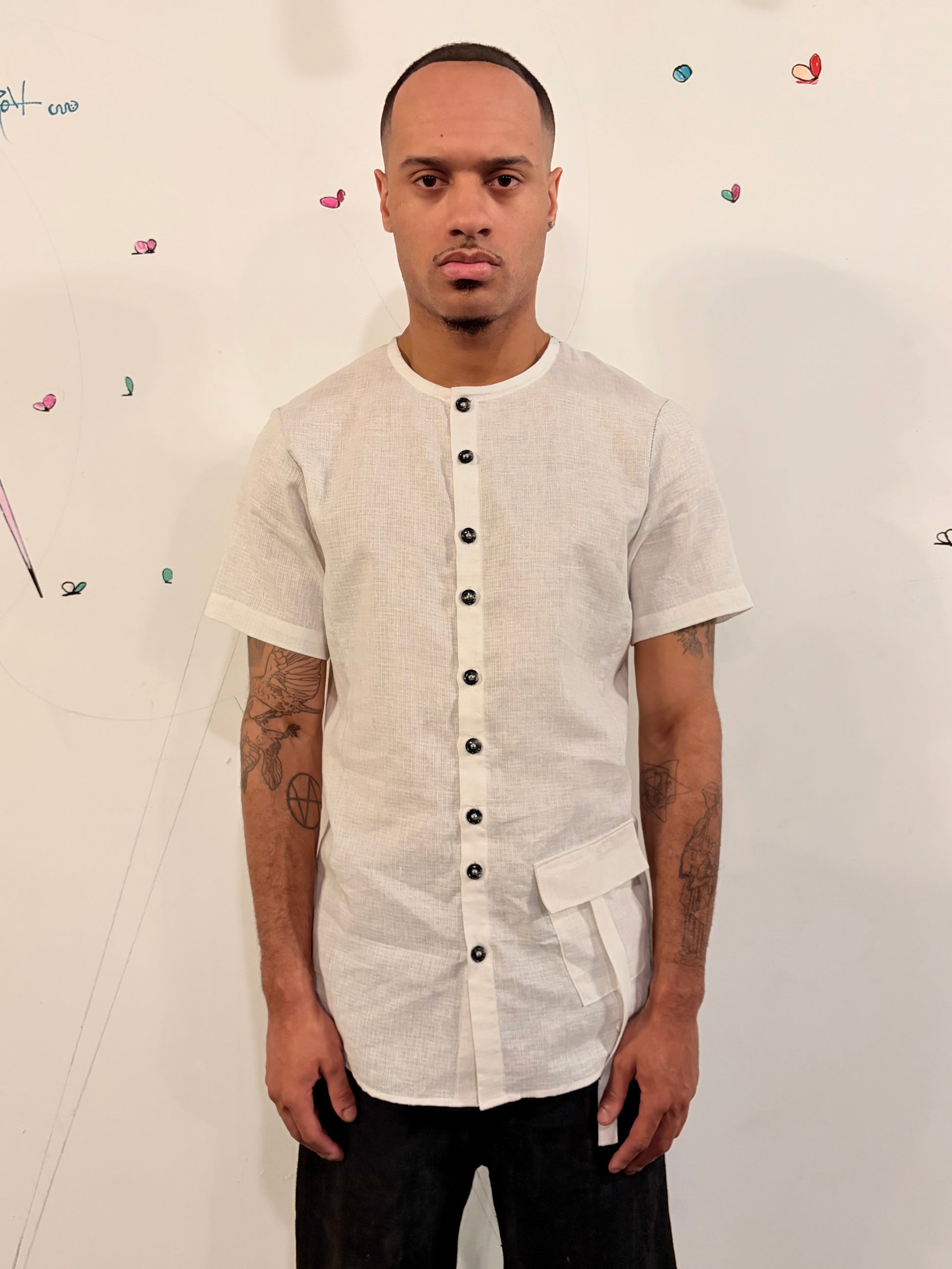 SS26 || COLLARLESS 3 PANEL BACK VENT SHIRT || SHORT SLEEVE - WHITE