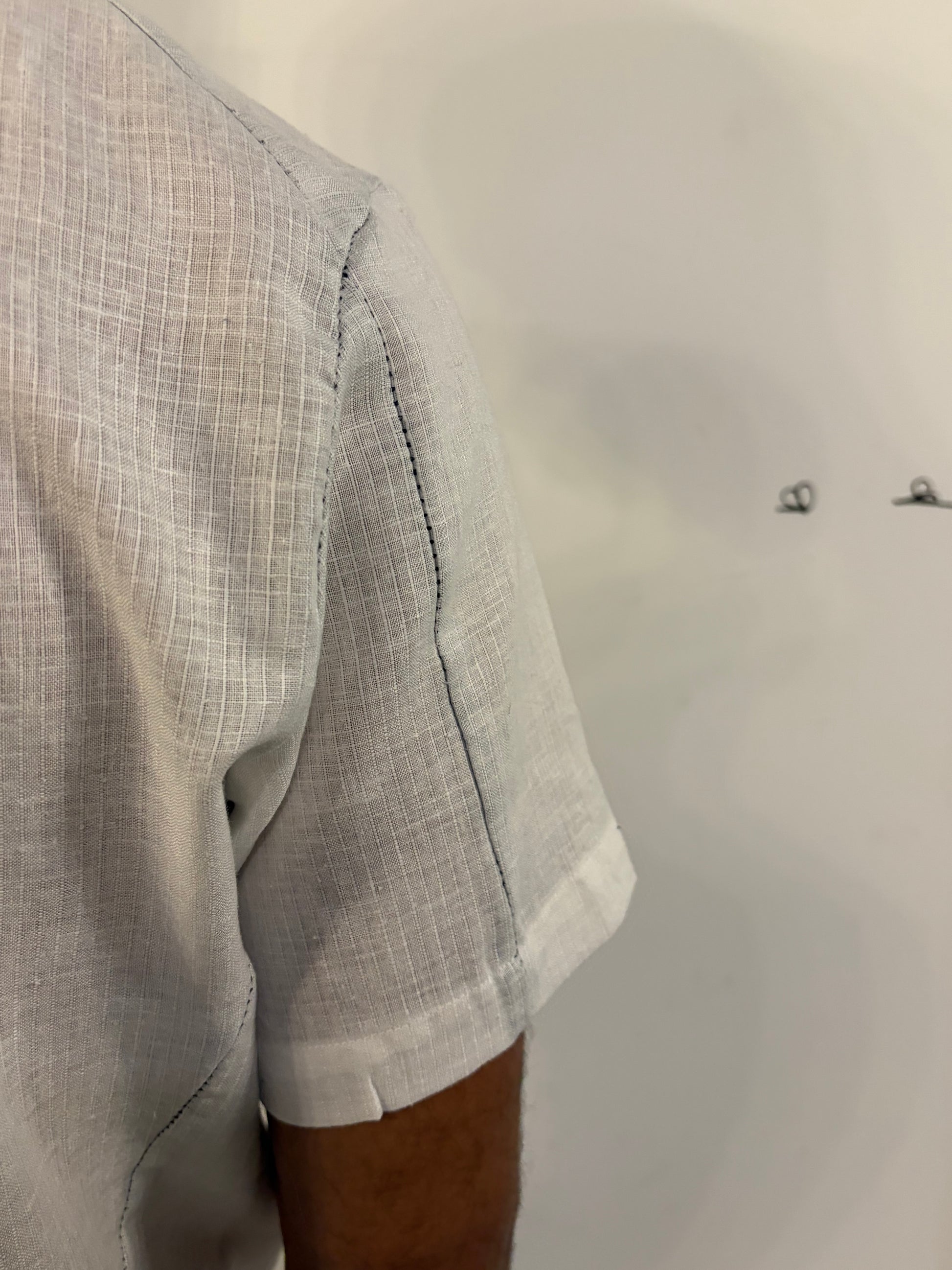 the shirt has no collar, and made from a 3 panel pattern with an interesting "back vent" detail that adds an element of formality to an otherwise casual shirt.