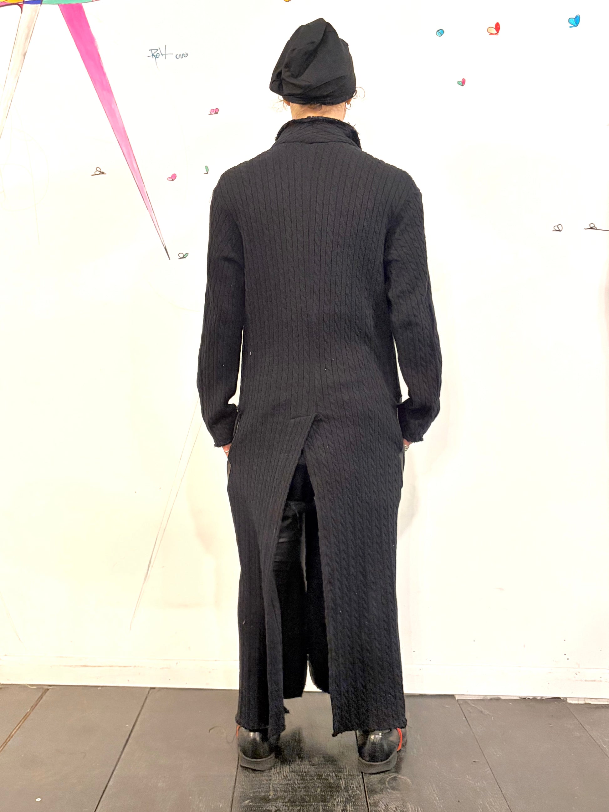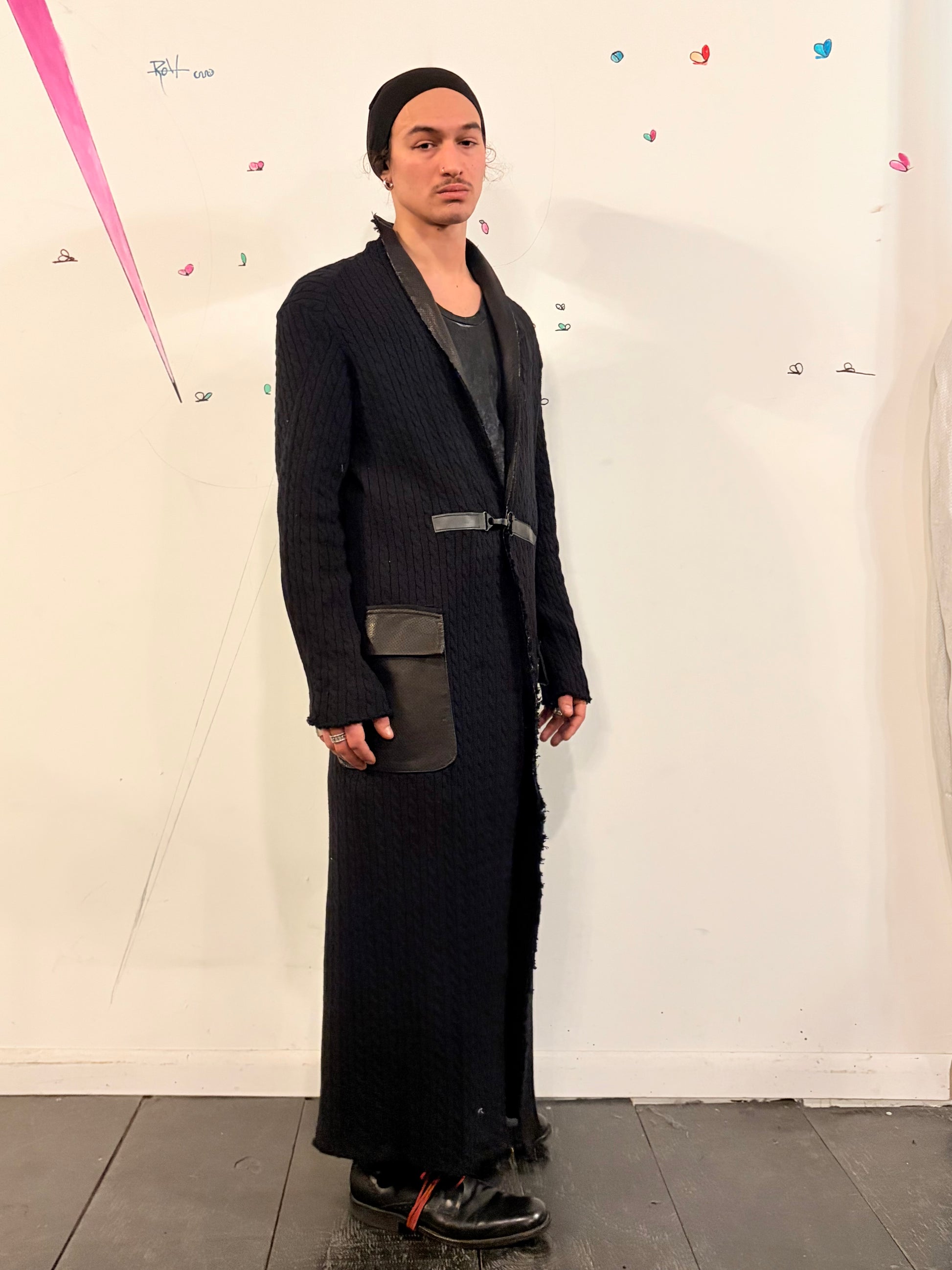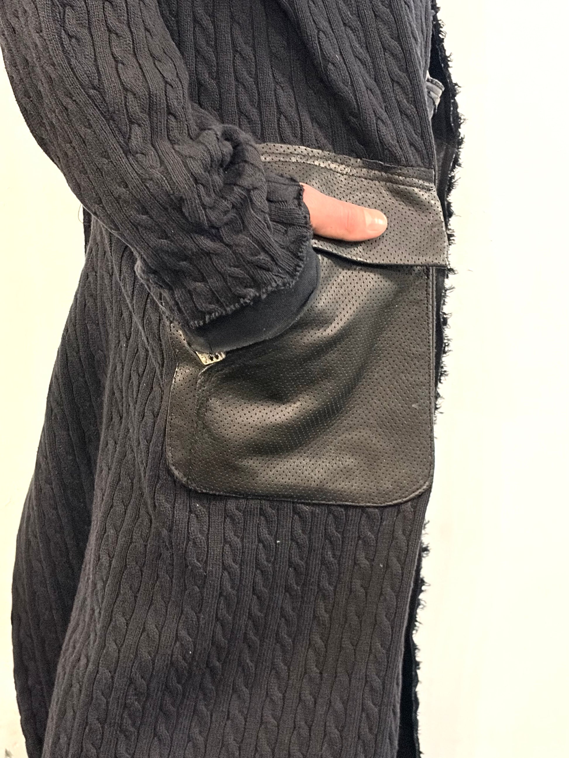 This example of the concept, developed as a long cardigan rendered in a cable knit that has been overdyed black. the cardigan has double side pockets on the outside, made in perforated calf hide that also is used as a facing for the collar and front - the garment closes with a single inside button and a black hook and loop closuure on the outside