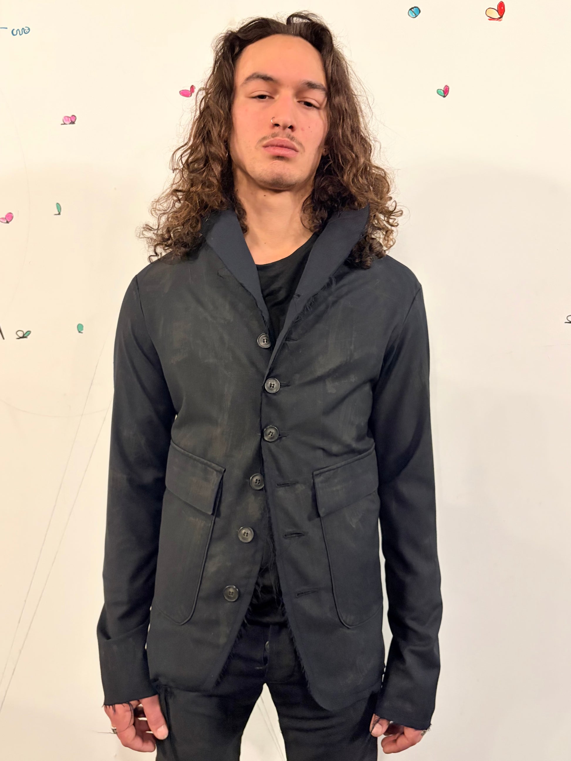 This version of the blazer is made from a lightweight 100% tropical wool It has two double front pockets with flap closures which allow you to enter the inner portion of the pocket from the top horizontally, and the outer portion from the side vertically. The jacket has two back vents, working surgeon cuffs on the sleeve. The front lapel and collar of the jacket is left unfinished for a rough "hewn" look. the garment has been treated with our special volcanic Sulphur clay mix for unusual textural effects on the garment