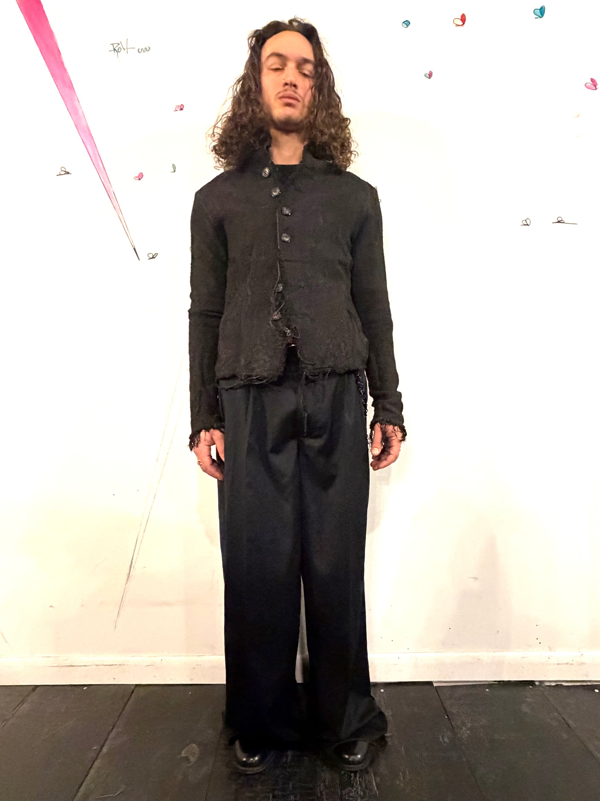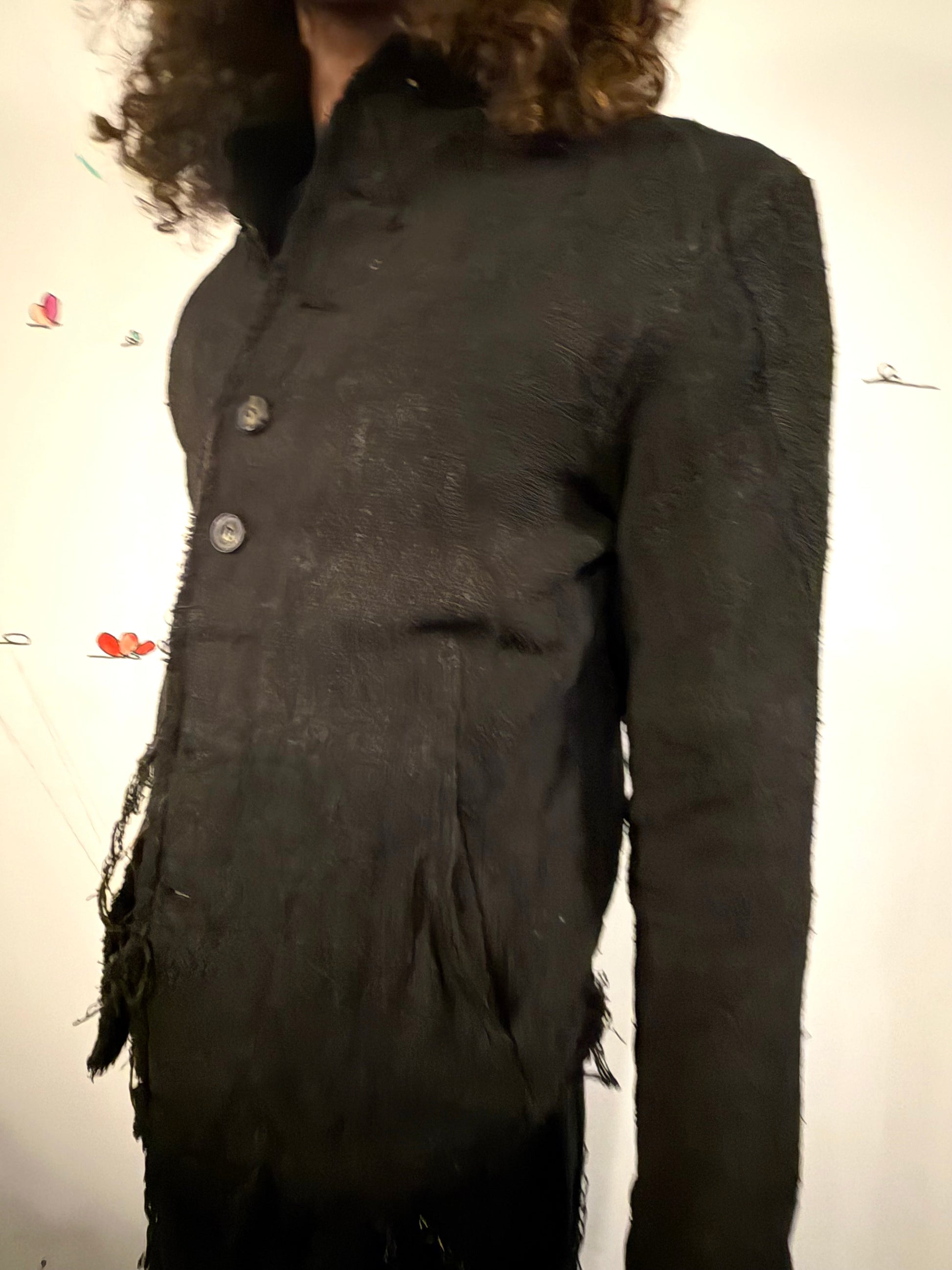 This version of the shirt is made in 100% HEAVY RAW SILK fabric that has been overdyed and washed in a black color. THE GARMENT HAS BEEN TREATED Wirth our specially developed Volcanic Sulphur Clay coating.