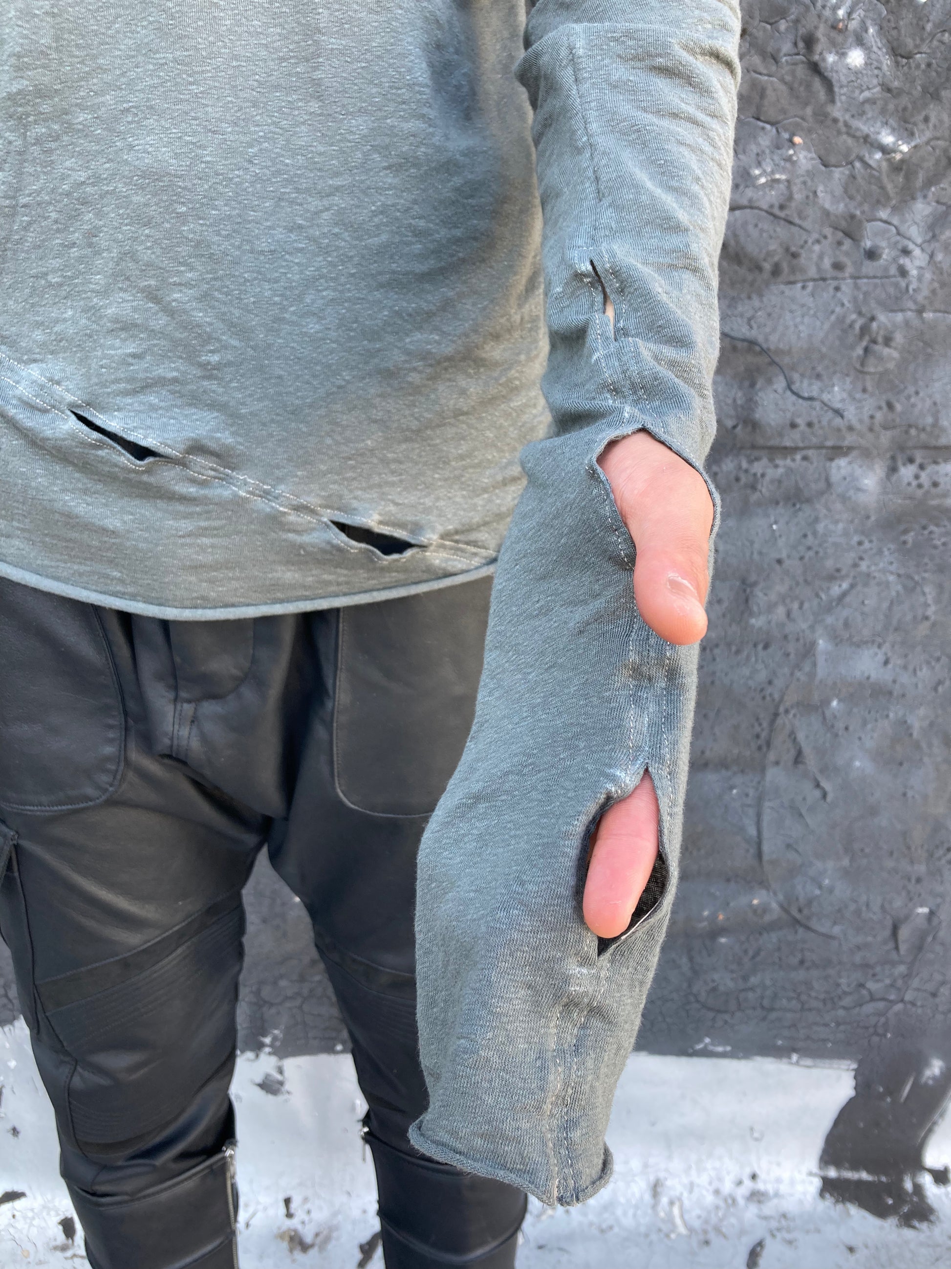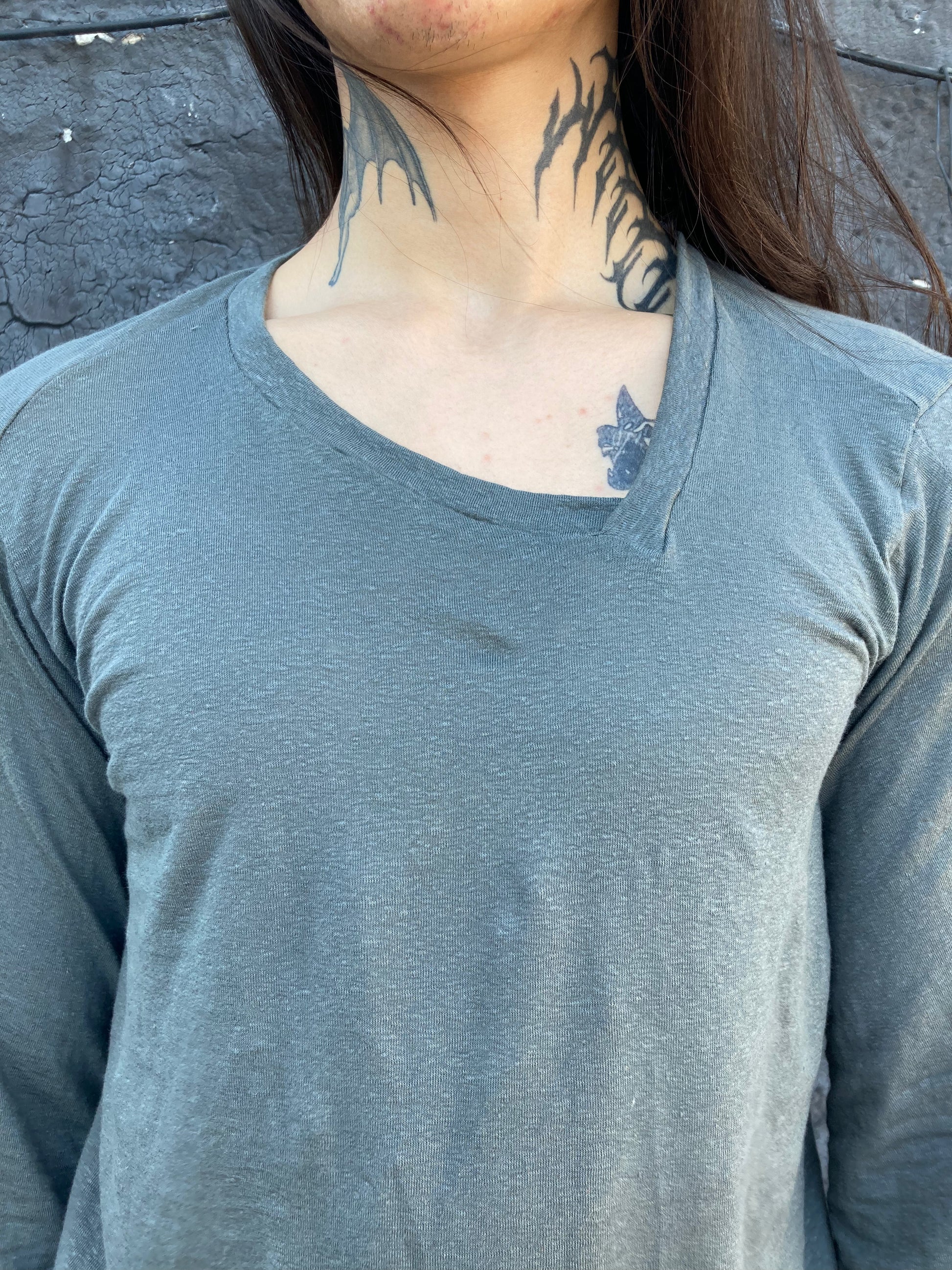 This shirt is cut with an asymmetric V Neck that angles to the left. the shirt has a slightly curved hem and a diagonal seam at front that is sewn with three "open seam detail. the open seam detail is also repeated on the sleeve, with a 'gloved" effect. this allows the wearer to adjust the sleeve to be worn as desired in several different ways.