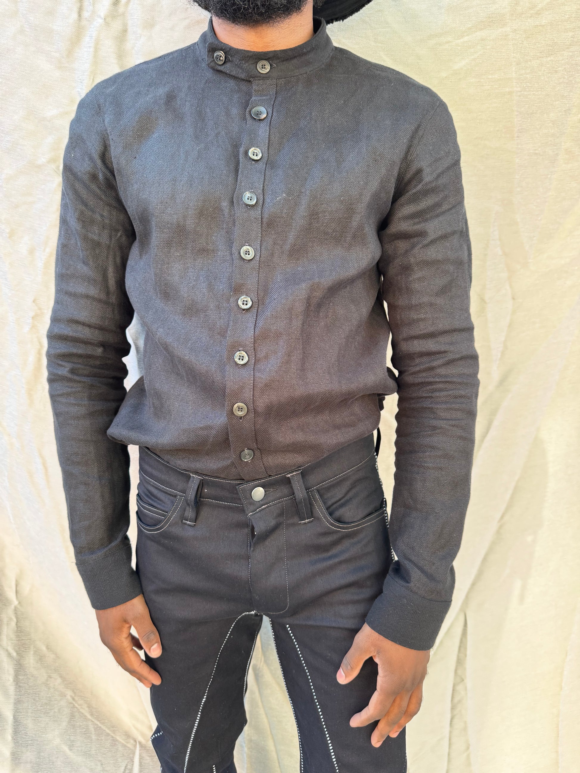 For this variant, the shirt is made in TWO FABRICS, BOTH 100% LINEN. The front of the shirt is a vintage plain weave linen in black and the back is a cotton/ linen blend with a slightly "crinkled" texture that compliments the fabric at front
