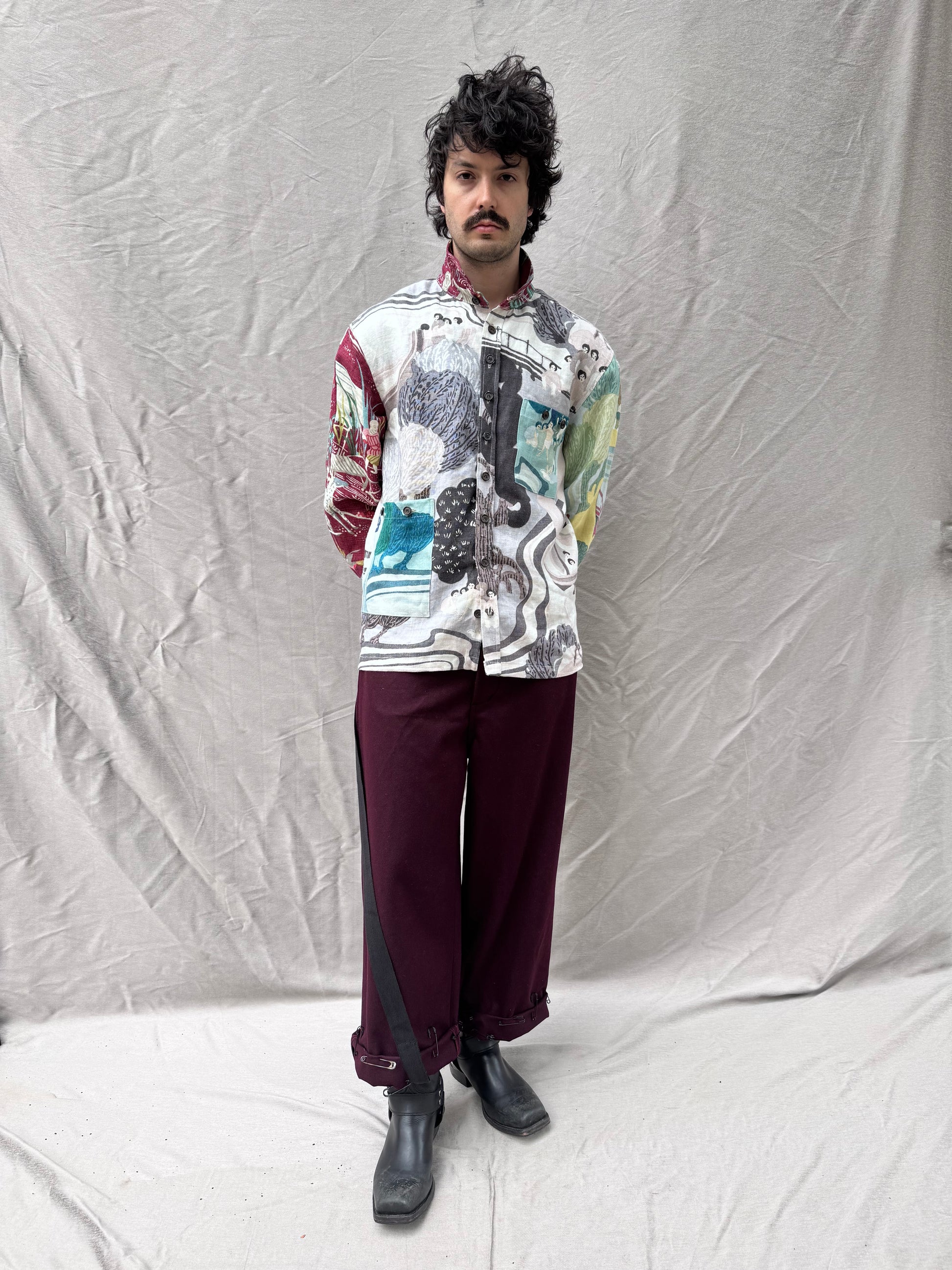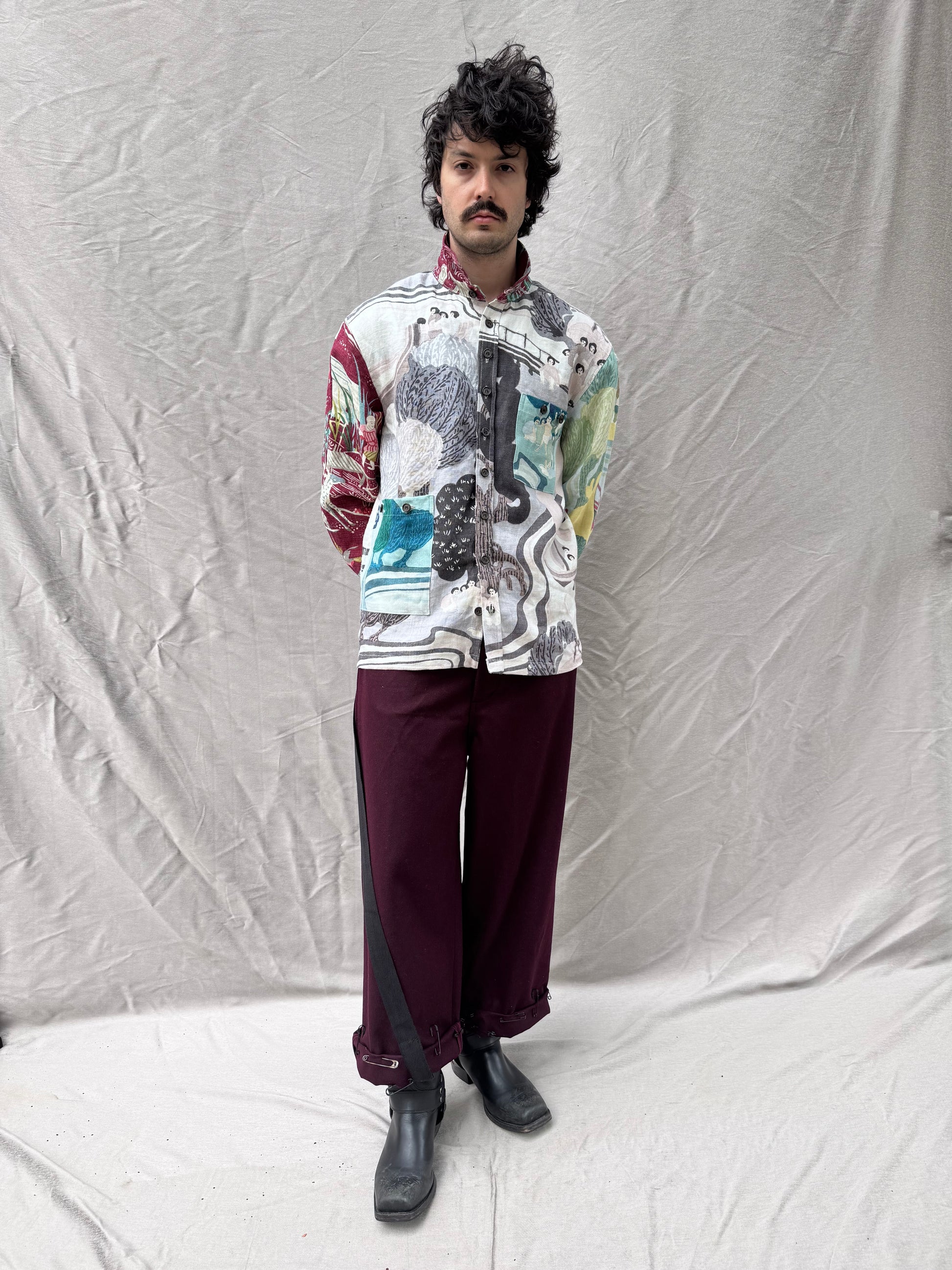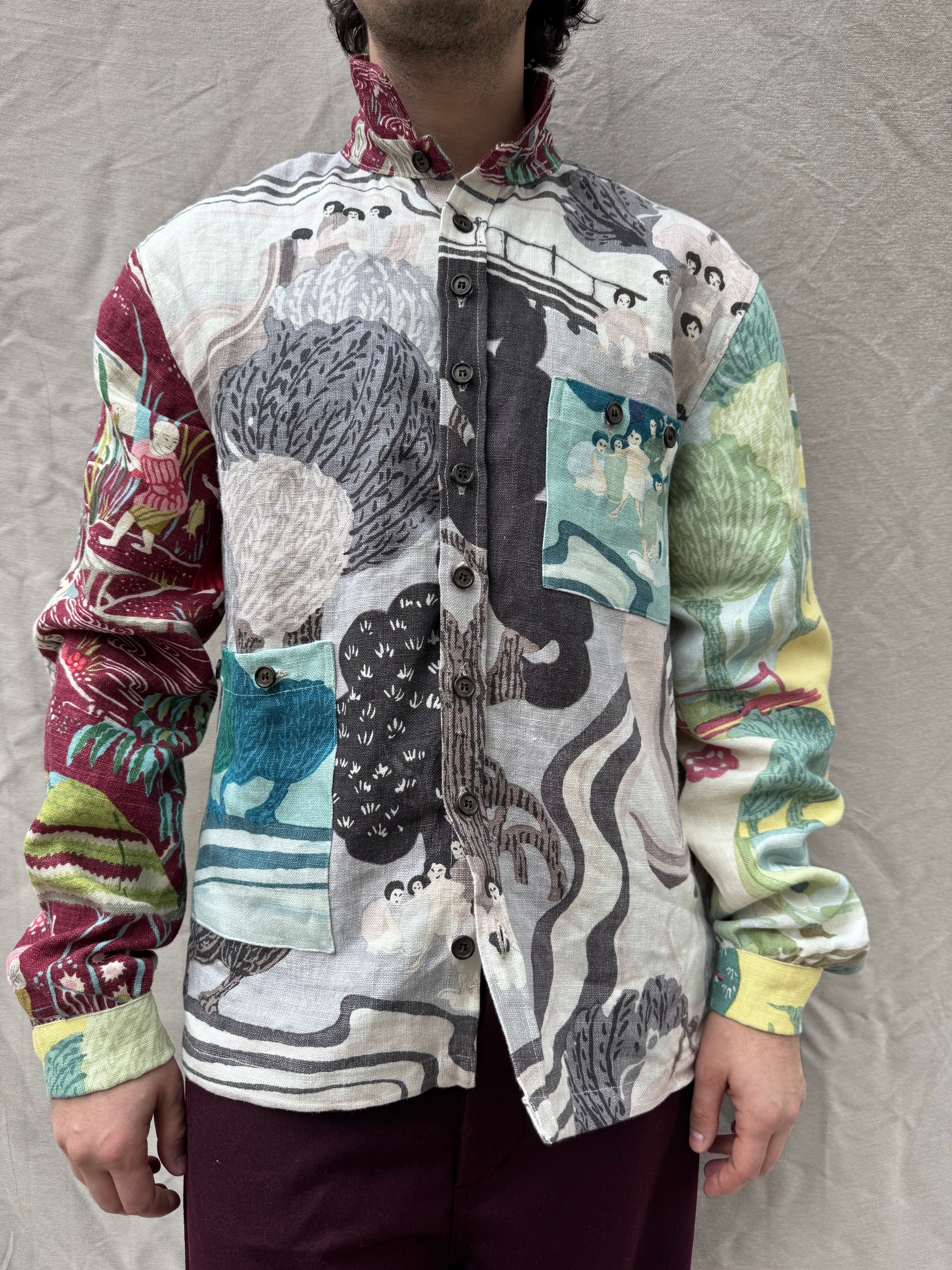 The faulted shoulder individual box shirt is a new release for the FW25 Season. the shirt was originally conceptualized several years ago and existed as a prototype until now. FW25 is its first release. Made here in 100% heavy linen print, the shirt is called an "INDIVIDUAL" shirt because no two shirts are alike. the print comes in multiple different colorways with each panel such as the body or sleeve being cut in a different color.